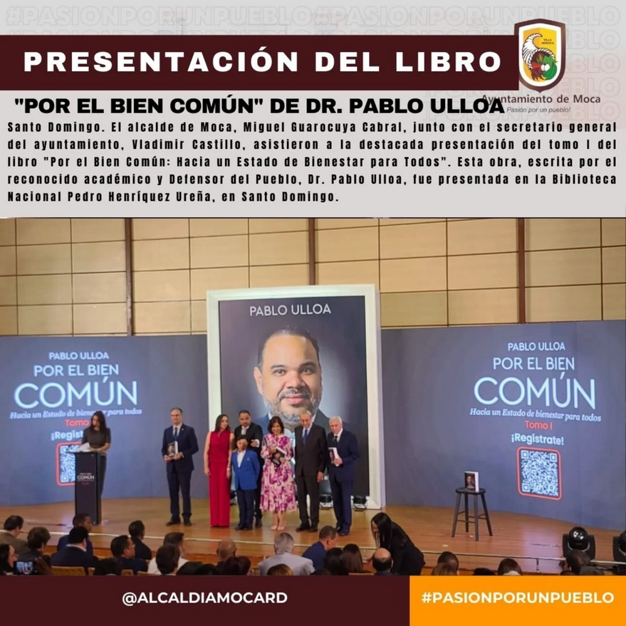 Moca,04/02/25. Santo Domingo. El alcalde de Moca, Miguel Guarocuya Cabral, junto con el secretario general del ayuntamiento, Vladimir Castillo, asistieron a la destacada presentación del tomo I del libro «Por el Bien Común: Hacia un Estado de Bienestar para Todos». Esta obra, escrita por el reconocido académico y Defensor del Pueblo, Dr. Pablo Ulloa, fue presentada en la Biblioteca Nacional Pedro Henríquez Ureña, en Santo Domingo.