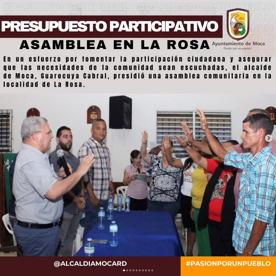 En un esfuerzo por fomentar la participación ciudadana y asegurar que las necesidades de la comunidad sean escuchadas, el alcalde de Moca, Guarocuya Cabral, presidió una asamblea comunitaria en la localidad de La Rosa. Este encuentro es parte del continuo proceso de asambleas comunitarias destinadas a decidir las obras a financiarse con el presupuesto participativo del municipio.