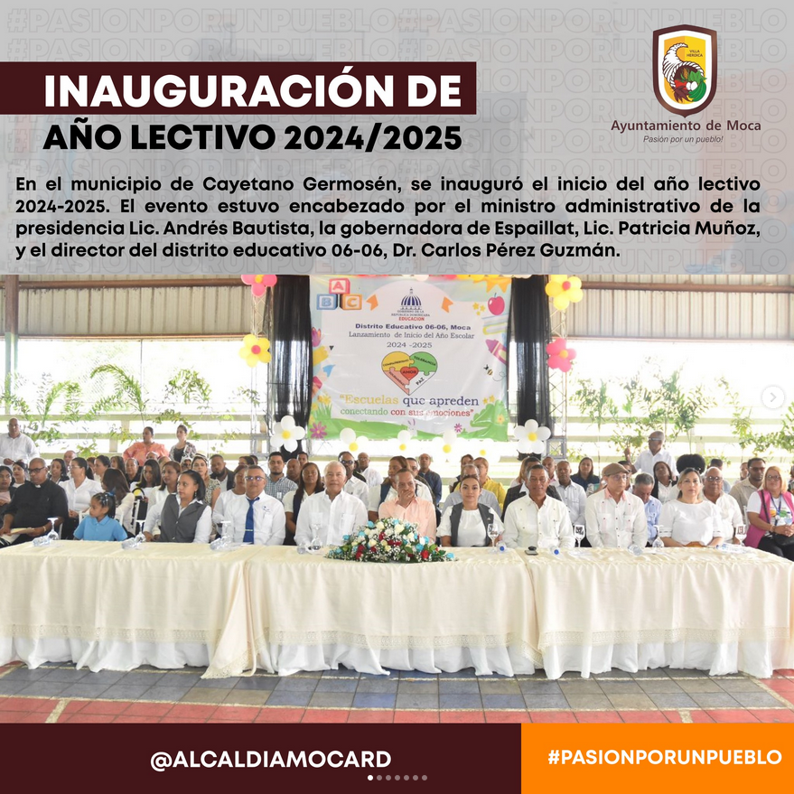 En una destacada ceremonia celebrada en el municipio de Cayetano Germosén, provincia Espaillat, se inauguró el inicio del año lectivo 2024-2025. El evento estuvo encabezado por el ministro administrativo de la presidencia Lic. Andrés Bautista, la gobernadora de Espaillat, Lic. Patricia Muñoz, y el director del distrito educativo 06-06, Dr. Carlos Pérez Guzmán. Además el alcalde de Cayetano Germosén Ing. Julio Abréu y la vicealcaldesa, Belkis Candelier, representó al alcalde Guarocuya Cabral en este relevante acto.
