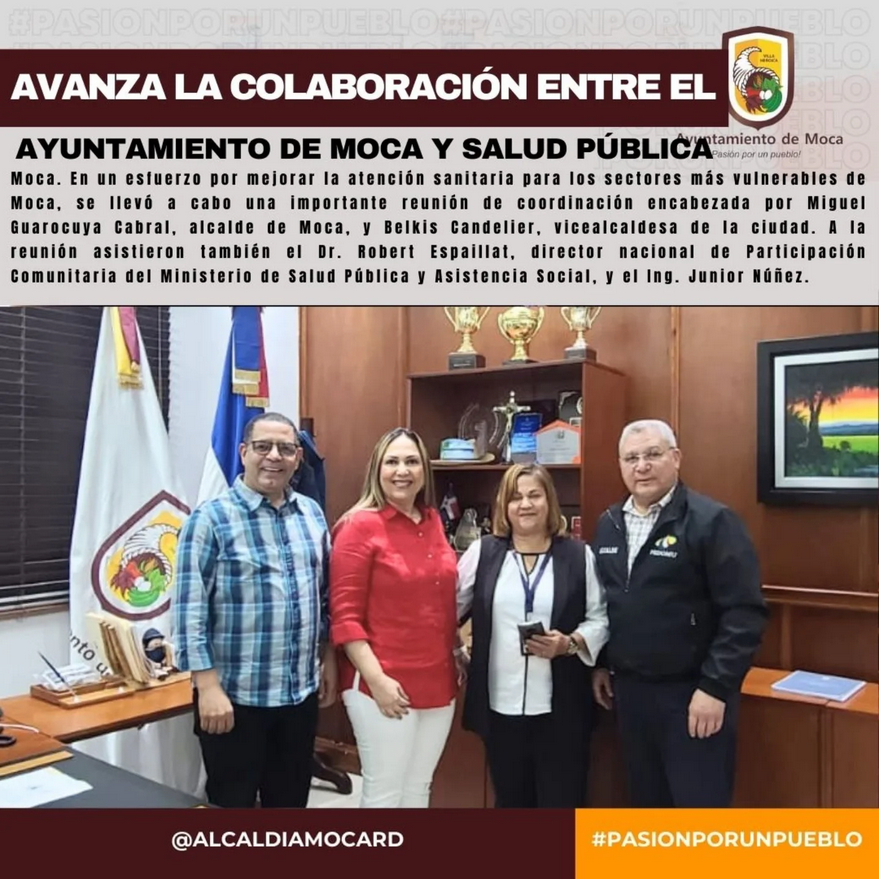 En un esfuerzo por mejorar la atención sanitaria para los sectores más vulnerables de Moca, se llevó a cabo una importante reunión de coordinación encabezada por Miguel Guarocuya Cabral, alcalde de Moca, y Belkis Candelier, vicealcaldesa de la ciudad. A la reunión asistieron también el Dr. Robert Espaillat, director nacional de Participación Comunitaria del Ministerio de Salud Pública y Asistencia Social, y el Ing. Junior Núñez.
