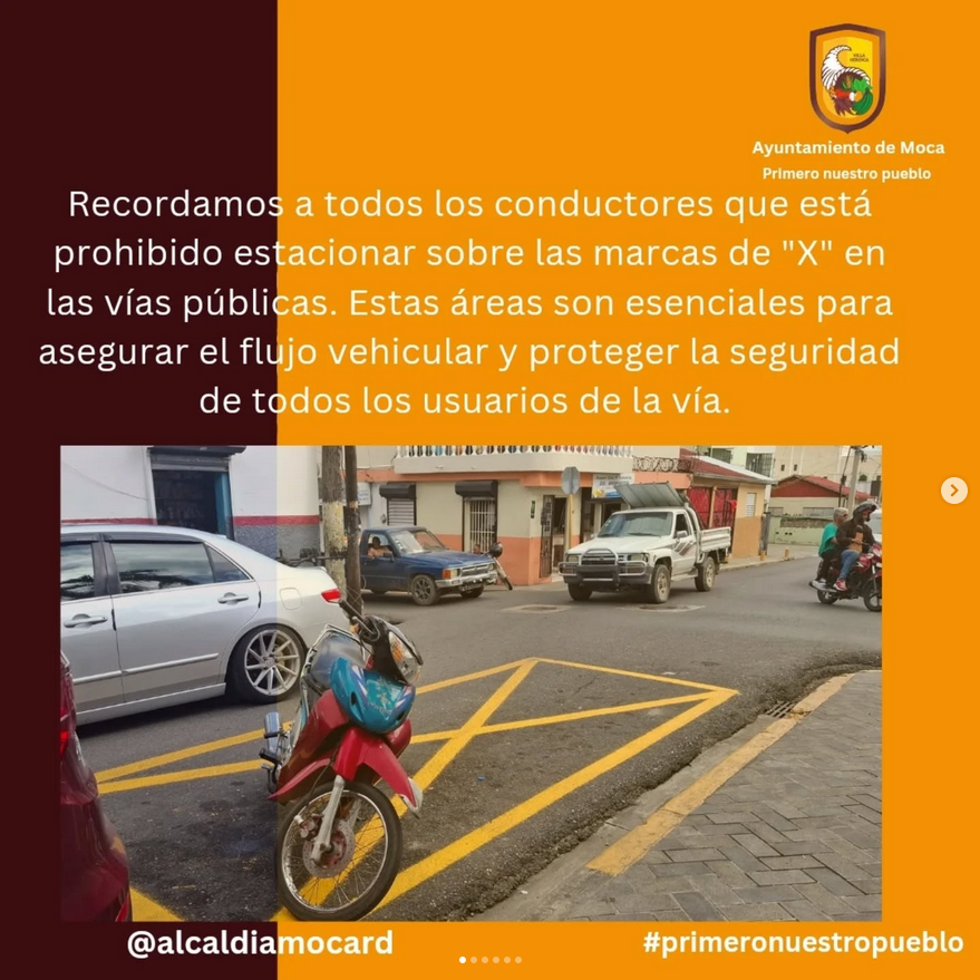 Moca,19/12/24. Recordamos a todos los conductores que está prohibido estacionar sobre las marcas de «X» en las vías públicas. Estas áreas son esenciales para asegurar el flujo vehicular y proteger la seguridad de todos los usuarios de la vía. En el municipio de Moca, es fundamental que cada uno de nosotros respete las señales viales. Conduzcamos con responsabilidad y consideración. ADVERTIMOS SOBRE LA IMPOSICIÓN DE ALTAS MULTAS Y TRASLADO EN GRÚA DE LOS VEHICULOS INFRACTORES.