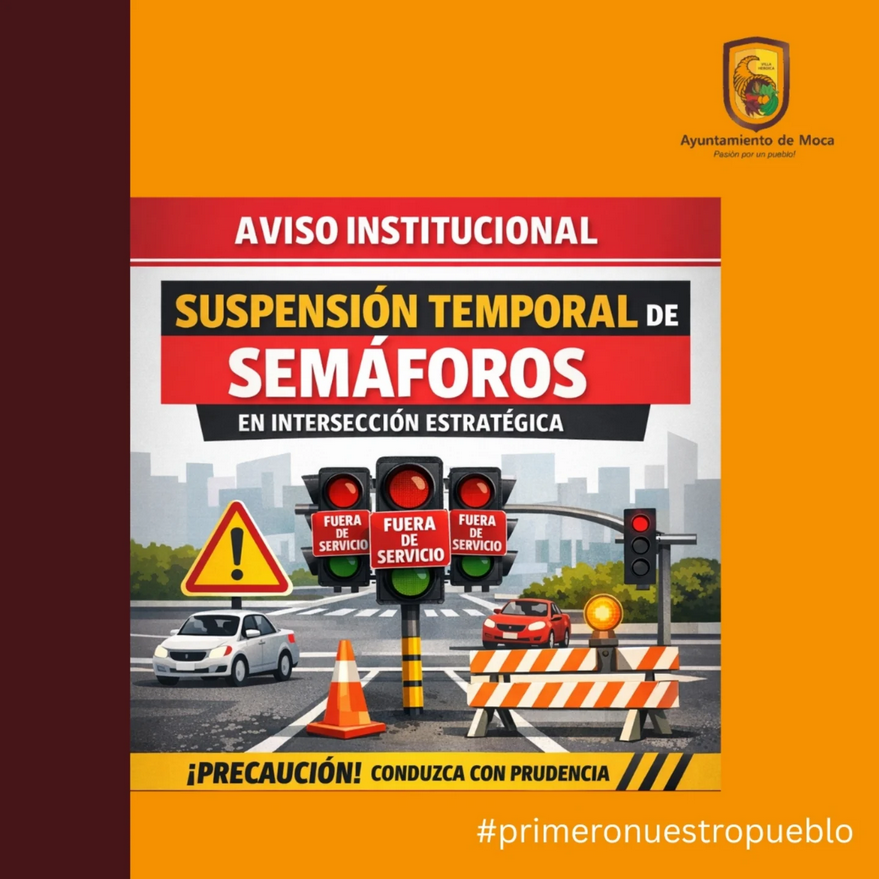 La Alcaldía de Moca informa a toda la ciudadanía, y de manera especial a los conductores y peatones que transitan por la Avenida Los Agricultores esquina calle Duarte (frente al Palacio de Justicia), que el sistema de semáforos en dicho punto se encuentra actualmente fuera de servicio debido a fallas técnicas imprevistas, ajenas al control de nuestra administración local.