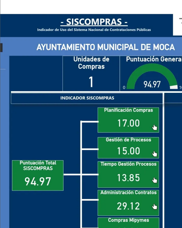 Moca,19/04/25. El Ayuntamiento de Moca ha alcanzado un nuevo hito en su destacada gestión municipal, logrando los más altos indicadores en el Ranking del Siscompras del trimestre enero-marzo. Con una calificación sobresaliente de 94.97, el ayuntamiento mocano se ha posicionado por encima de las otras 158 corporaciones edilicias del país.