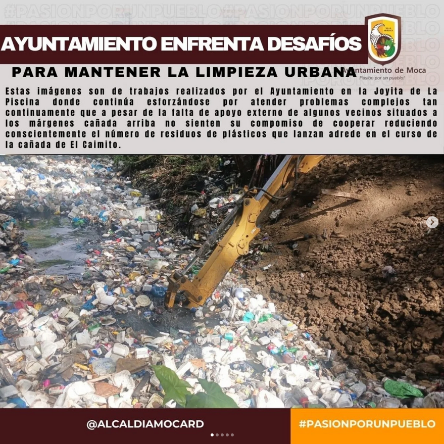 Estas imágenes son de trabajos realizados por el Ayuntamiento en la Joyita de La Piscina donde continúa esforzándose por atender problemas complejos tan continuamente que a pesar de la falta de apoyo externo de algunos vecinos situados a los márgenes cañada arriba no sienten su compomiso de cooperar reduciendo conscientemente el número de residuos de plásticos que lanzan adrede en el curso de la cañada de El Caimito. A medida que se utilizan recursos limitados, persiste el desafío de gestionar áreas donde una parte de la población no colabora en mantener la limpieza, especialmente en zonas cercanas a dicha cañada. La situación se complica por la creencia entre algunos residentes de que el municipio es el único responsable de limpiar los desechos arrojados imprudentemente al agua, lo cual excede la capacidad operativa y financiera de la estructura municipal de Moca. El ayuntamiento hace un llamado a la colaboración ciudadana para enfrentar estos desafíos de manera conjunta, porque con la imprudencia y la insensatez de algunos pagamos justos por pecadores. En estas imágenes observamos los ingentes esfuerzos que hace el ayuntamiento de Moca por disposición del alcalde Miguel Guarocuya Cabral, y el empeño de los departamentos correspondientes coordinados por el Ing Junior Núñez y el Lic. Franklin Maldonado.