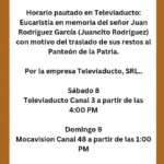 Horario pautado en Televiaducto: Eucaristía en memoria del señor Juan Rodríguez García (Juancito Rodríguez) con motivo del traslado de sus restos al Panteón de la Patria.