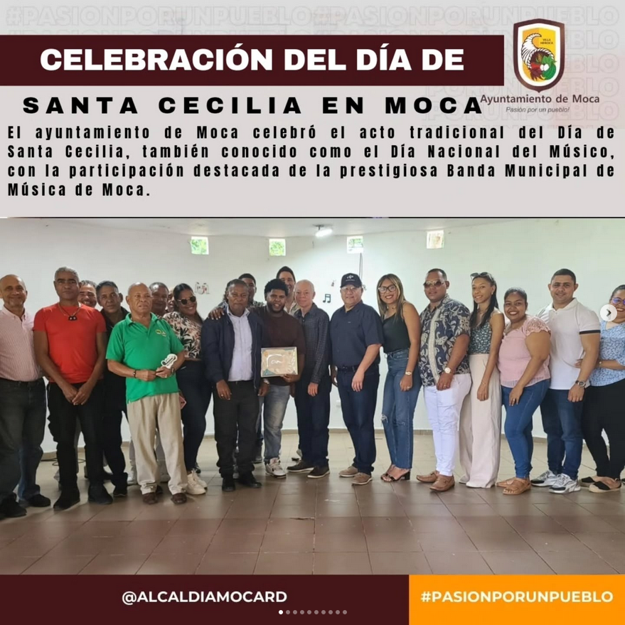 El ayuntamiento de Moca celebró el acto tradicional del Día de Santa Cecilia, también conocido como el Día Nacional del Músico, con la participación destacada de la prestigiosa Banda Municipal de Música de Moca. Este evento, que ha sido un pilar de la comunidad desde 2006, contó con la cordinación del profesor José Ramón Matías, director municipal de Cultura, el asesor cultural del ayuntamiento prof. Luis Quezada, Pastora Sosa y su equipo de protocolo, Luis Santana, y Nancy Muñoz, con la dirección del maestro Porfirio Méndez y la colaboración de 38 talentosos músicos de academia.
