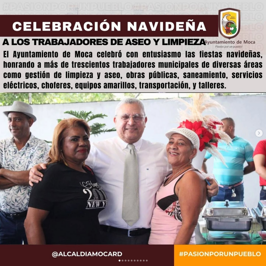 Moca,14/12/24. El Ayuntamiento de Moca celebró con entusiasmo las fiestas navideñas, honrando a más de trescientos trabajadores municipales de diversas áreas como gestión de limpieza y aseo, obras públicas, saneamiento, servicios eléctricos, choferes, equipos amarillos, transportación, y talleres. El evento contó con la presencia del alcalde Guarocuya Cabral y su esposa Emely, el secretario general Vladimir Castillo, la directora de Recursos Humanos, Billy Almanzar, Luis Santana, Miguel Angel Fernández, Alberto Garcia, entre otros servidores municipales.