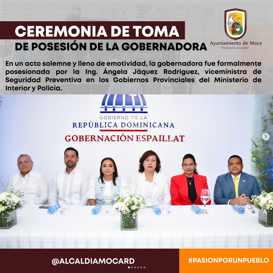 La ceremonia contó con la presencia de destacadas personalidades de la comunidad, entre ellos el alcalde Guarocuya Cabral, el embajador y presidente provincial Lic. Emmanuel Bautista, el Lic. Sandy Méndez, director de CoraaMoca, la diputada Marleni Jiménez y su esposo, el ex diputado Jefry Grullón, los padres de la nueva gobernadora Prof. Deonisa Salcedo y Ramón Muñoz. Un numeroso público también se congregó para apoyar este importante evento oficial, reflejando la expectativa y confianza depositada en la nueva administración provincial.
