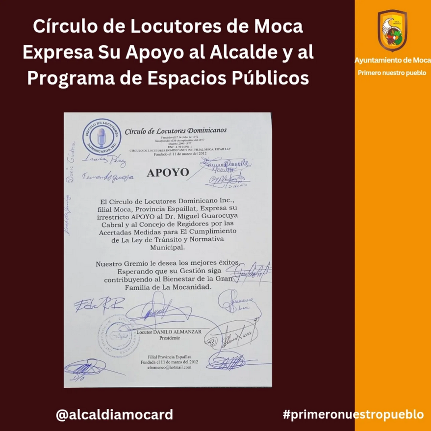 En un emotivo acto de solidaridad y gratitud, el presidente del Círculo de Locutores Dominicanos filial Moca-Espaillat, locutor Danilo Almánzar «Remeneo», entregó una declaración de apoyo al alcalde Miguel Guarocuya Cabral, al Dr. Gabriel Rivas, presidente de la comisión especial de tránsito y al resto de los miembros del ayuntamiento. Este gesto se enmarca en el reconocimiento al éxito del programa “Espacios Públicos Libres y Parquearse Bien”, implementado con responsabilidad y profesionalismo.