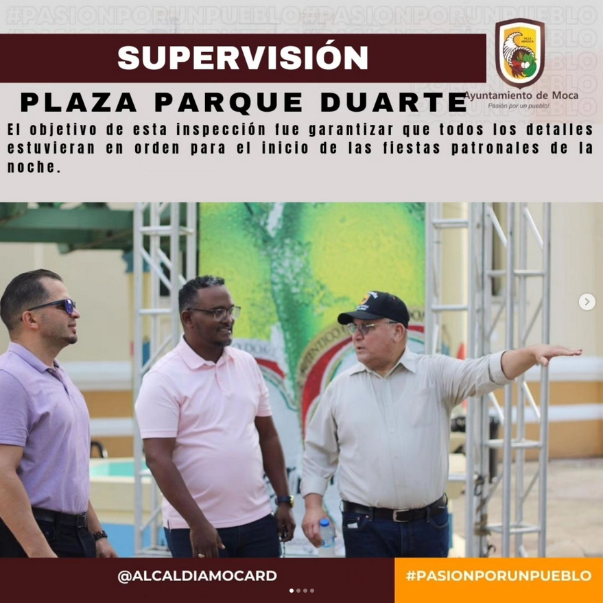 Comisión Permanente de Fiestas Patronales Nuestra Señora del Rosario de Moca, junto al alcalde Guarocuya Cabral, realizaron una supervisión detallada del área de la tarima y los juegos mecánicos situados en la Plaza Parque Duarte.