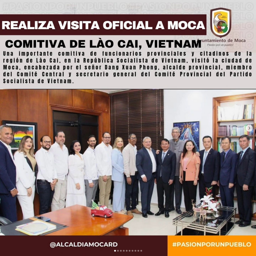 Una importante comitiva de funcionarios provinciales y citadinos de la región de Lào Cai, en la República Socialista de Vietnam, visitó la ciudad de Moca, encabezada por el señor Dang Xuan Phong, alcalde provincial, miembro del Comité Central y secretario general del Comité Provincial del Partido Socialista de Vietnam. La delegación estaba compuesta por 18 servidores públicos del país indochino.
