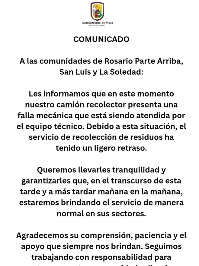 Agradecemos su comprensión, paciencia y el apoyo que siempre nos brindan. Seguimos trabajando con responsabilidad para mantener nuestras comunidades limpias y organizadas.