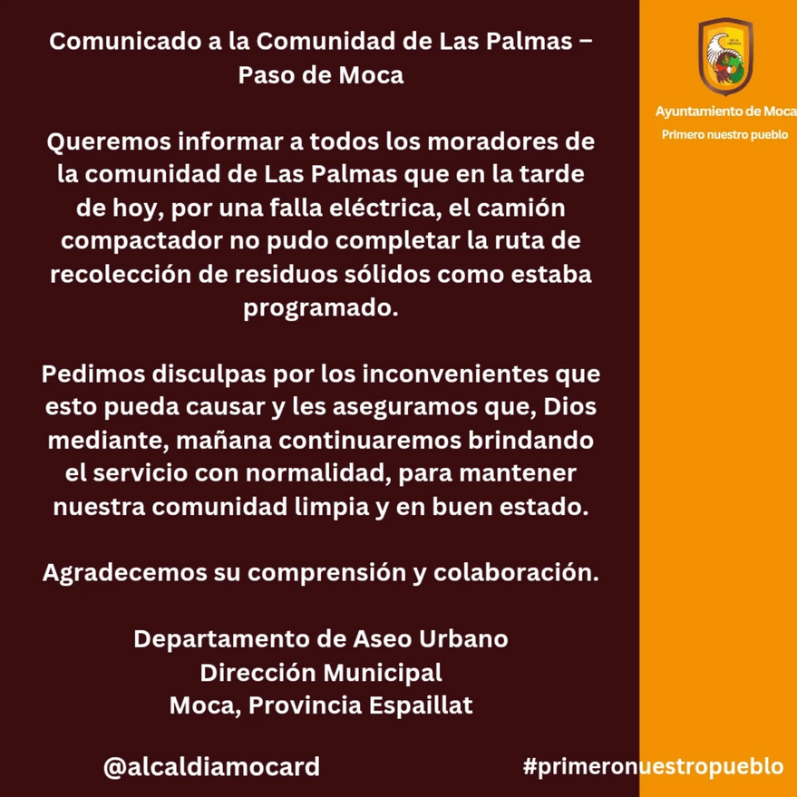 Queremos informar a todos los moradores de la comunidad de Las Palmas que en la tarde de hoy, por una falla eléctrica, el camión compactador no pudo completar la ruta de recolección de residuos sólidos como estaba programado.