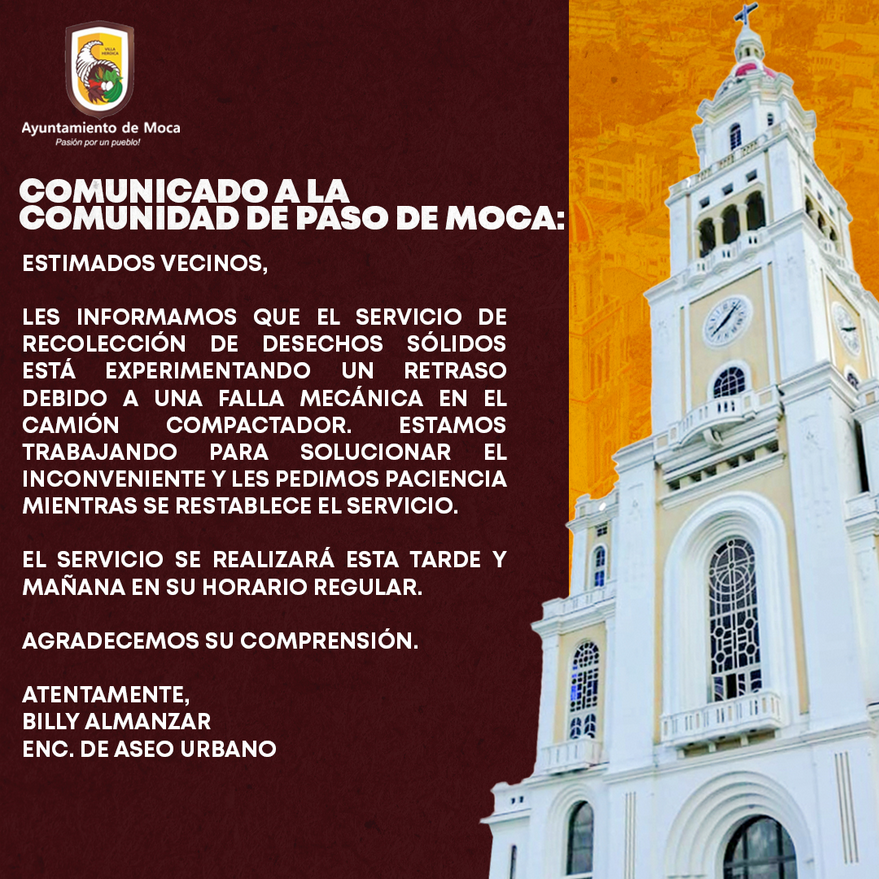 Les informamos que el servicio de recolección de desechos sólidos está experimentando un retraso debido a una falla mecánica en el camión compactador. Estamos trabajando para solucionar el inconveniente y les pedimos paciencia mientras se restablece el servicio.