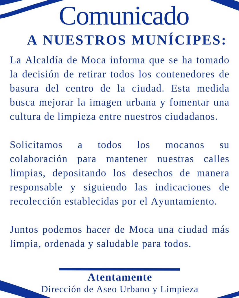 La Alcaldía de Moca informa que se ha tomado la decisión de retirar todos los contenedores de basura del centro de la ciudad. Esta medida busca mejorar la imagen urbana y fomentar una cultura de limpieza entre nuestros ciudadanos.