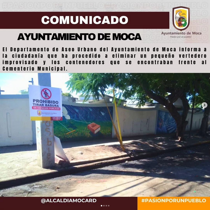 El Departamento de Aseo Urbano del Ayuntamiento de Moca informa a la ciudadanía que ha procedido a eliminar un pequeño vertedero improvisado y los contenedores que se encontraban frente al Cementerio Municipal. Dicho punto se había convertido en un foco de contaminación debido al manejo inadecuado de los desechos sólidos por parte de algunos munícipes.