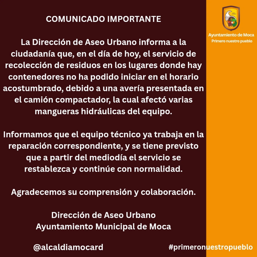 La Dirección de Aseo Urbano informa a la ciudadanía que, en el día de hoy, el servicio de recolección de residuos en los lugares donde hay contenedores no ha podido iniciar en el horario acostumbrado, debido a una avería presentada en el camión compactador, la cual afectó varias mangueras hidráulicas del equipo.