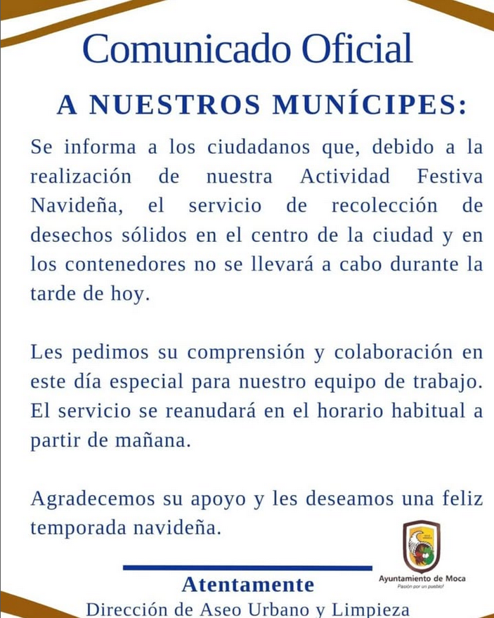 Moca,14/12/24. Se informa a los ciudadanos que, debido a la realización de nuestra Actividad Festiva Navideña, el servicio de recolección de desechos sólidos en el centro de la ciudad y en los contenedores no se llevará a cabo durante la tarde de hoy.