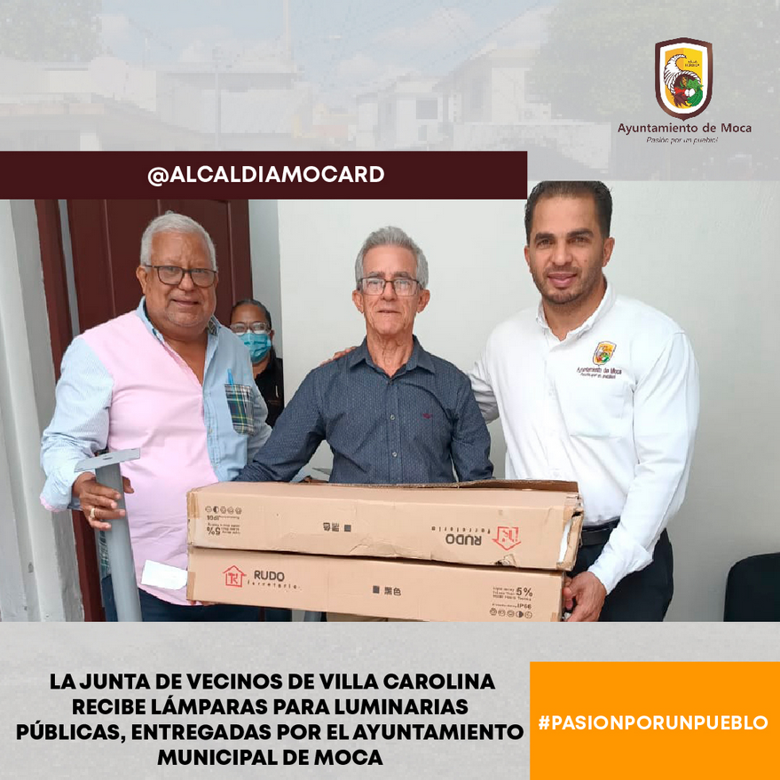 Con alianzas público comunitarias hacemos avanzar a Moca. La Junta de vecinos de Villa Carolina recibe lámparas para luminarias públicas, entregadas por el ayuntamiento para ser instaladas por miembros de la junta de vecinos a manera de una mutual de colaboración a fin de avanzar juntos en la solución común de los problemas del barrio competencia de la municipalidad. Asimismo se hace una ciudad de todos.