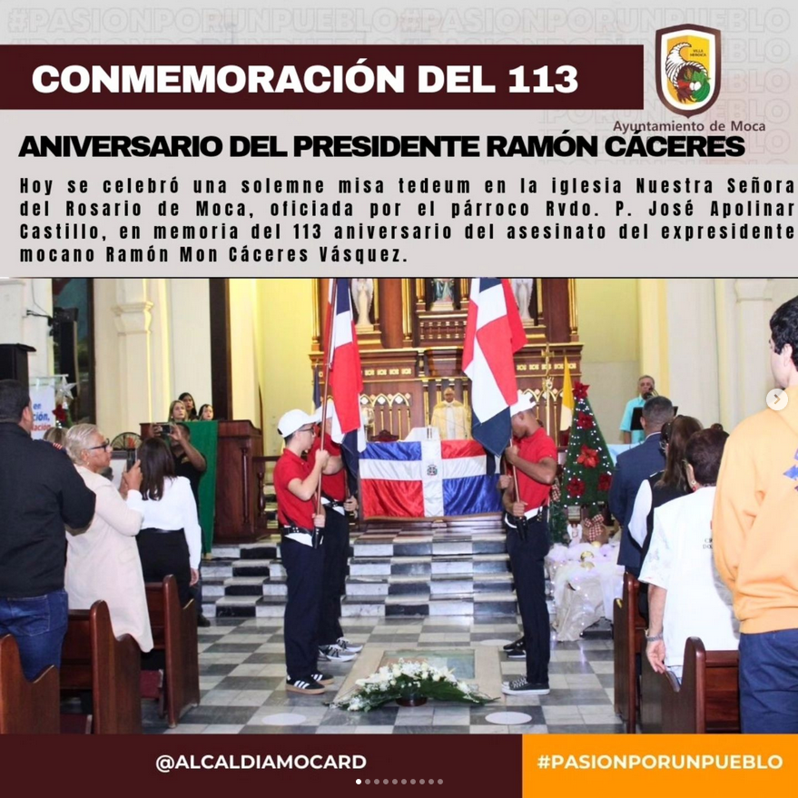 Se celebró una solemne misa tedeum en la iglesia Nuestra Señora del Rosario de Moca, oficiada por el párroco Rvdo. P. José Apolinar Castillo, en memoria del 113 aniversario del asesinato del expresidente mocano Ramón Mon Cáceres Vásquez. Estuvieron presentes los nietos del presidente Cáceres: María Isabel, Ana María, Mario Tadeo y Rosa Pierina Cáceres Perdomo, hijos de don Mario Cáceres y doña Nidia Perdomo de Cáceres.