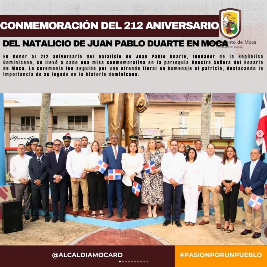 En honor al 212 aniversario del natalicio de Juan Pablo Duarte, fundador de la República Dominicana, se llevó a cabo una misa conmemorativa en la parroquia Nuestra Señora del Rosario de Moca. La ceremonia fue seguida por una ofrenda floral en homenaje al patricio, destacando la importancia de su legado en la historia dominicana.