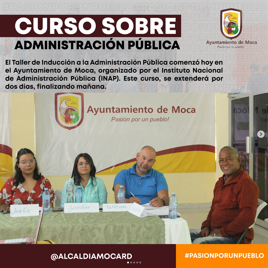– El «Taller de Inducción a la Administración Pública» comenzó hoy en el Ayuntamiento de Moca, organizado por el Instituto Nacional de Administración Pública (INAP). La Ing. Rosabel Casado actúa como facilitadora de este curso, que se extenderá por tres días, finalizando mañana. Este evento está dirigido a los servidores públicos del Ayuntamiento Municipal de Moca y ha sido coordinado a través del departamento de Recursos Humanos.