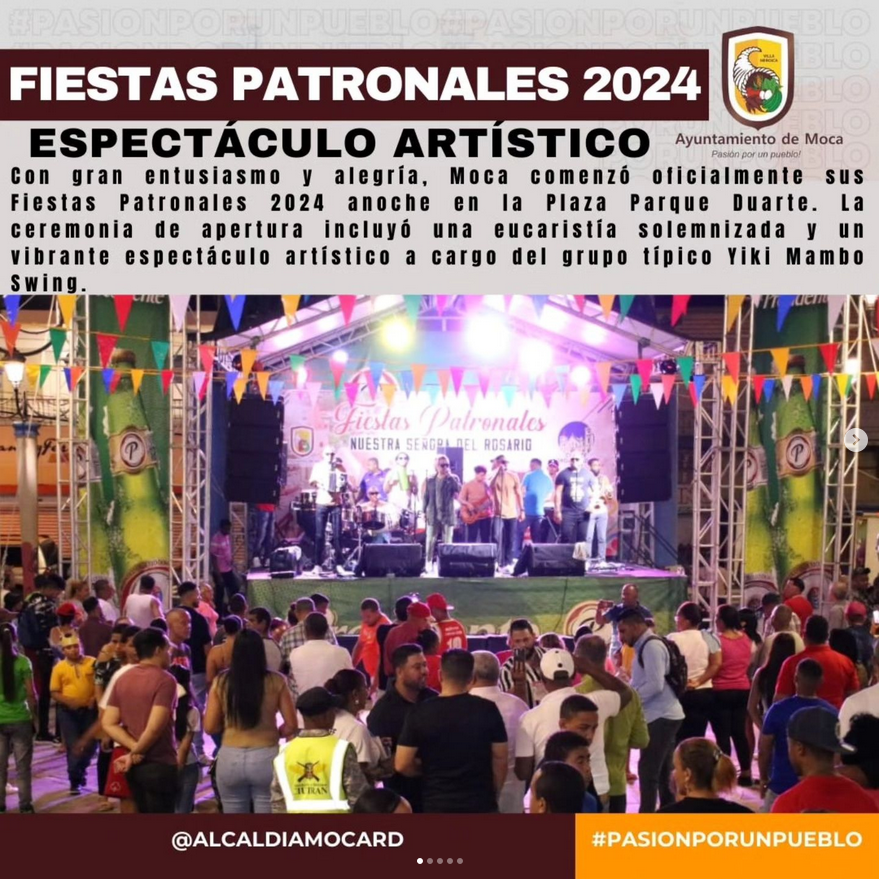 Con gran entusiasmo y alegría, Moca comenzó oficialmente sus Fiestas Patronales 2024 anoche en la Plaza Parque Duarte. La ceremonia de apertura incluyó una eucaristía solemnizada y un vibrante espectáculo artístico a cargo del grupo típico Yiki Mambo Swing. La comunidad se vio apoyada por la presencia de autoridades locales y una multitud de ciudadanos que se reunieron para participar en esta significativa tradición.