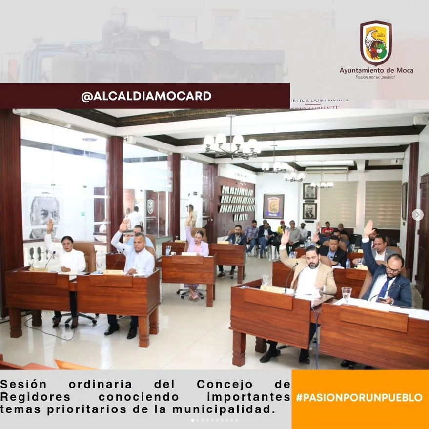 Desarrollo de la sesión ordinaria del Concejo de Regidores presidida por el presidente Serafin Arroyo, acompañado del alcalde Guarocuya Cabral, la Secretaria Municipal, y el quorum correspondiente de los regidores presentes en la sala de sesiones conociendo importantes temas prioritarios de la municipalidad como: PMOT Plan Municipal de Ordenamiento Territorial y el compromiso de esta administración municipal de desarrollar un programa permanente de vialidad y tránsito en la ciudad del viaducto.