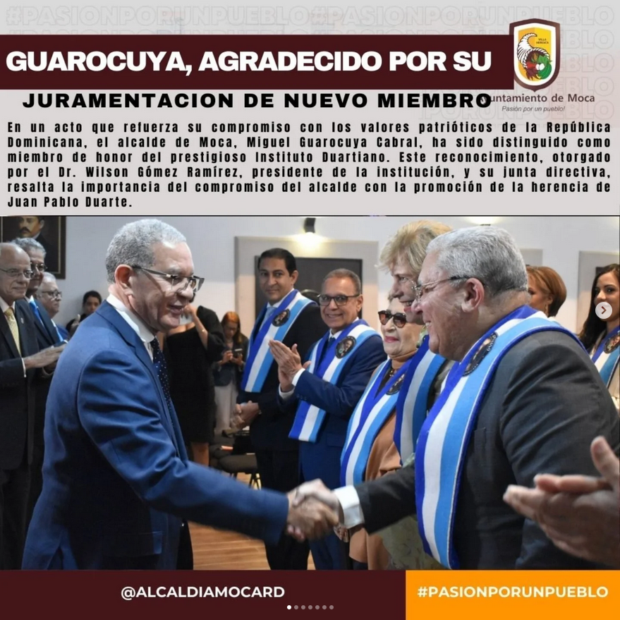 Moca,08/02/25. En un acto que refuerza su compromiso con los valores patrióticos de la República Dominicana, el alcalde de Moca, Miguel Guarocuya Cabral, ha sido distinguido como miembro de honor del prestigioso Instituto Duartiano. Este reconocimiento, otorgado por el Dr. Wilson Gómez Ramírez, presidente de la institución, y su junta directiva, resalta la importancia del compromiso del alcalde con la promoción de la herencia de Juan Pablo Duarte.