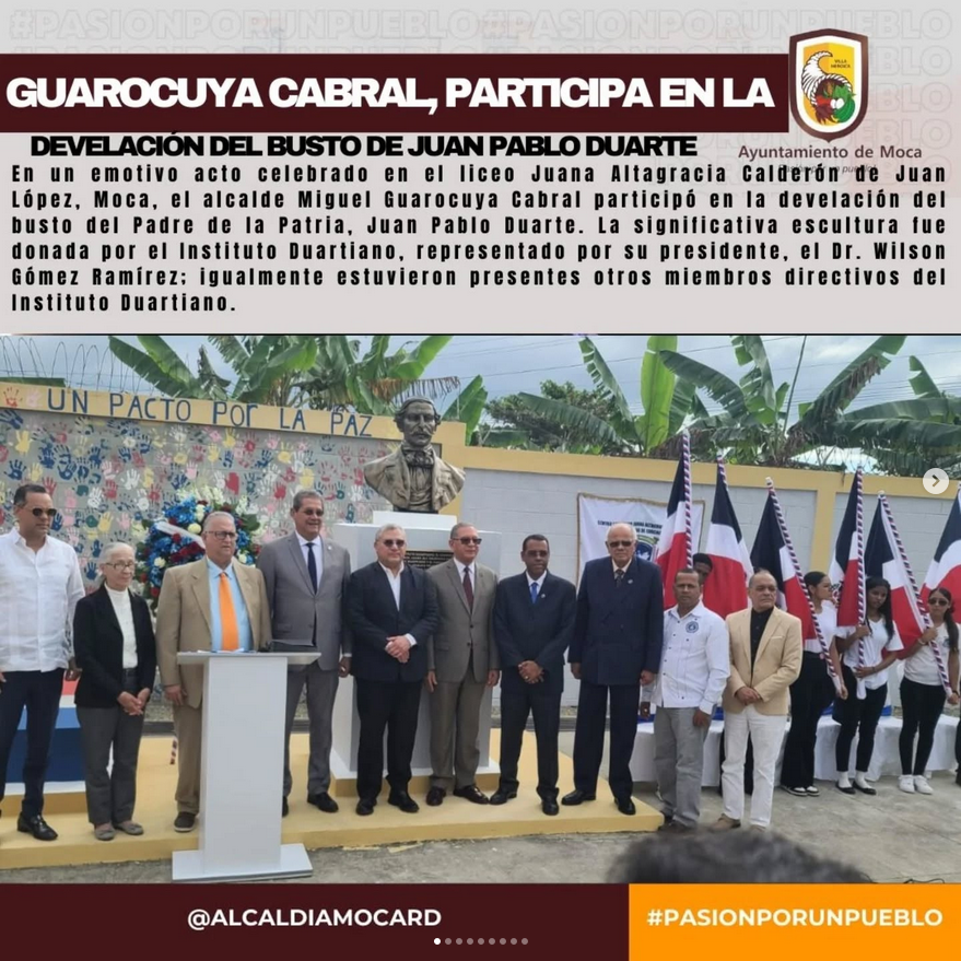 En un emotivo acto celebrado en el liceo Juana Altagracia Calderón de Juan López, Moca, el alcalde Miguel Guarocuya Cabral participó en la develación del busto del Padre de la Patria, Juan Pablo Duarte. La significativa escultura fue donada por el Instituto Duartiano, representado por su presidente, el Dr. Wilson Gómez Ramírez; igualmente estuvieron presentes otros miembros directivos del Instituto Duartiano.