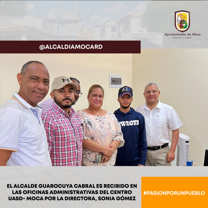 La directora del Centro UASD-Moca, la maestra Sonia Gómez Díaz recibió en las oficinas administrativas y de admisión al alcalde municipal Guarocuya Cabral quien fue orientado por la directora y observó el dinámico proceso de inscripciones y matriculación de la alta casa de estudios en la ciudad del viaducto. La UASD-Moca es una realidad gracias al presidente de la República, al señor rector de la primada de América, a un grupo de servidores públicos, de instituciones civiles, académicos, comunitarios, empresarios y comerciantes, que remaron hacia una misma dirección por los objetivos logrados.