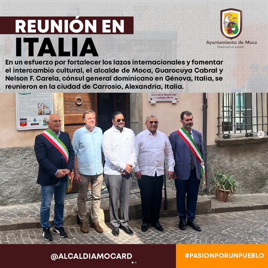 En un esfuerzo por fortalecer los lazos internacionales y fomentar el intercambio cultural, el alcalde de Moca, Guarocuya Cabral y Nelson F. Carela, cónsul general dominicano en Génova, Italia, se reunieron en la ciudad de Carrosio, Alexandria, Italia, con importantes figuras de la región. La reunión tuvo lugar el fin de semana y contó con la presencia de destacados funcionarios locales.