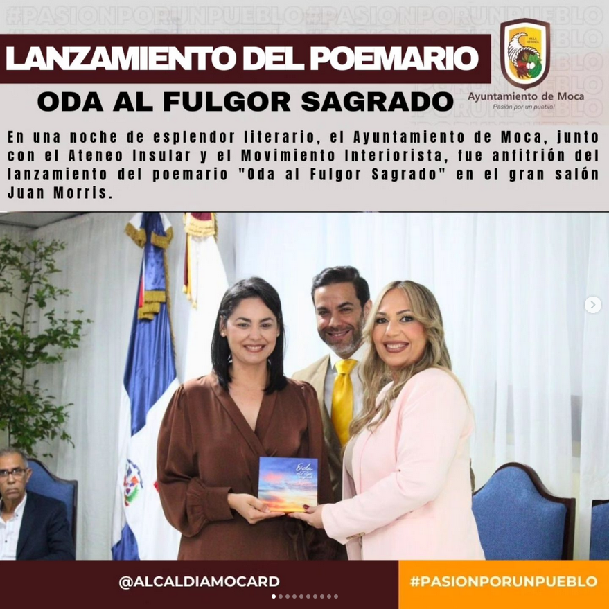 Moca,25 Octubre 2024. En una noche de esplendor literario, el Ayuntamiento de Moca, junto con el Ateneo Insular y el Movimiento Interiorista, fue anfitrión del lanzamiento del poemario «Oda al Fulgor Sagrado» en el gran salón Juan Morris. El evento, que contó con la masiva participación de autoridades y un selecto público amante de la poesía, marcó un hito cultural en la comunidad.