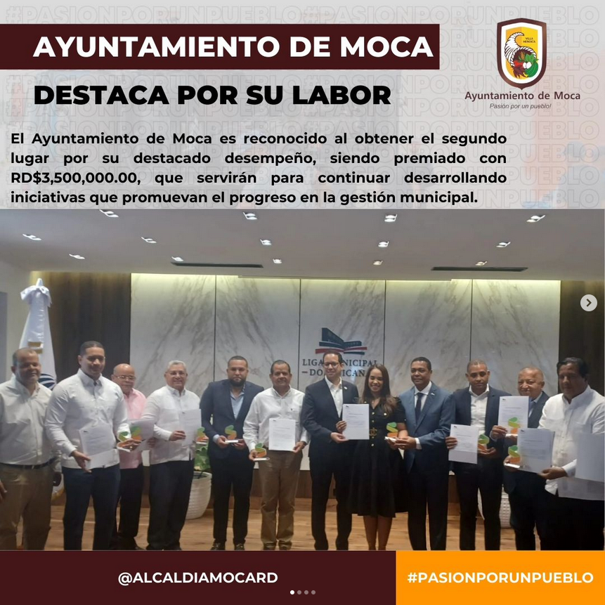 El Ayuntamiento de Moca ha sido distinguido con un reconocimiento notable al obtener el segundo lugar en la región Cibao Norte por su destacado desempeño en el año 2023. Este logro ha sido evaluado conforme a los indicadores del Sistema de Monitoreo de la Administración Pública Municipal (SISMAP Municipal). Como parte de este reconocimiento, el ayuntamiento ha sido premiado con RD$3,500,000.00, lo cual servirá para fortalecer y continuar desarrollando iniciativas que promuevan el progreso y la eficiencia en la gestión municipal. Este galardón refleja el compromiso y el esfuerzo constante de las autoridades locales y su equipo de trabajo por mejorar la calidad de vida de los ciudadanos de Moca. El alcalde de Moca Guarocuya Cabral lo recibe en nombre de todo el personal del ayuntamiento que con su esfuerzo ha mantenido el nivel de calidad institucional a través del Comité de Calidad de la municipalidad de la ciudad cuna de héroes y villa del viaducto.