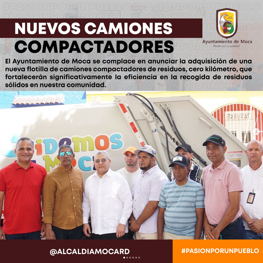 El Ayuntamiento de Moca se complace en anunciar la adquisición de una nueva flotilla de camiones compactadores de residuos, cero kilómetro, que fortalecerán significativamente la eficiencia en la recogida de residuos sólidos en nuestra comunidad. Este avance es posible gracias a la buena voluntad y generoso apoyo del Presidente de la República, el Ministro Administrativo de la Presidencia, Lic. Andrés Bautista, y la Liga Municipal Dominicana.