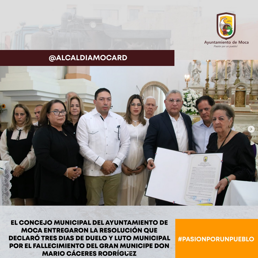 El concejo municipal del ayuntamiento de Moca, encabezado por el alcalde Guarocuya Cabral, la presidente del Concejo de Regidores Daysi Hilario, el regidor Francis Acosta y la Secretaria Municipal Mirian Jiménez entregaron la resolución que declaró tres dias de duelo y luto municipal por el fallecimiento del gran municipe mocano don Mario Cáceres Rodríguez. La entrega de la proclama municipal se hizo en manos de doña Ida Perdomo Vda. Cáceres e hijos, y posteriormente se interpretó el himno municipal de Moca en honor y memoria a don Mario.