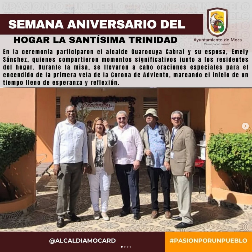 En el Hogar de Ancianos Desvalidos La Santísima Trinidad de Moca, se celebró una emotiva eucaristía de acción de gracias con motivo del primer domingo de Adviento 2024 y la semana aniversario del Hogar La Santísima Trinidad. En la ceremonia participaron el alcalde Guarocuya Cabral y su esposa, Emely Sánchez, quienes compartieron momentos significativos junto a los residentes del hogar. Durante la misa, se llevaron a cabo oraciones especiales para el encendido de la primera vela de la Corona de Adviento, marcando el inicio de un tiempo lleno de esperanza y reflexión.