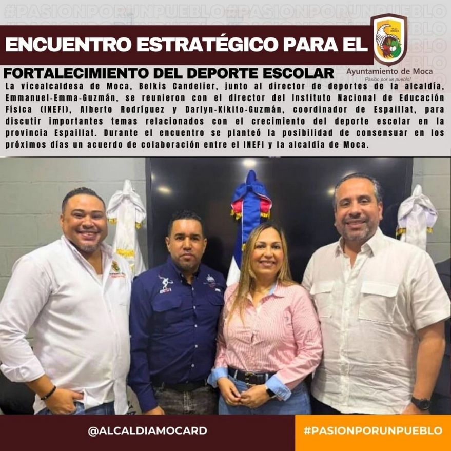 La vicealcaldesa de Moca, Belkis Candelier, junto al director de deportes de la alcaldía, Emmanuel-Emma-Guzmán, se reunieron con el director del Instituto Nacional de Educación Física (INEFI), Alberto Rodríguez y Darlyn-Kikito-Guzmán, coordinador de Espaillat, para discutir importantes temas relacionados con el crecimiento del deporte escolar en la provincia Espaillat. Durante el encuentro se planteó la posibilidad de consensuar en los próximos días un acuerdo de colaboración entre el INEFI y la alcaldía de Moca.