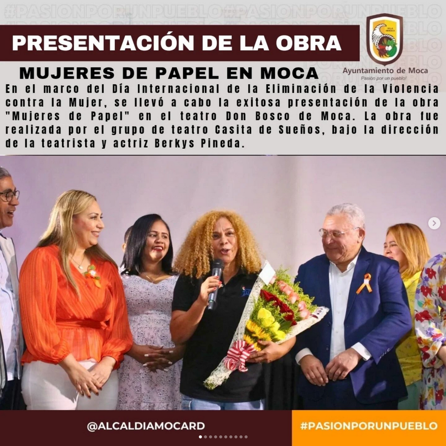 En el marco del Día Internacional de la Eliminación de la Violencia contra la Mujer, se llevó a cabo la exitosa presentación de la obra «Mujeres de Papel» en el teatro Don Bosco de Moca. La obra fue realizada por el grupo de teatro Casita de Sueños, bajo la dirección de la teatrista y actriz Berkys Pineda.