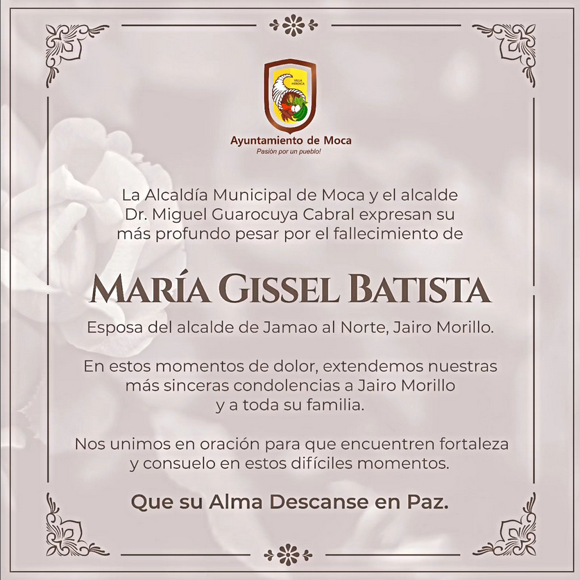 Nos entristece profundamente el fallecimiento de Maria Gissel, querida esposa del apreciado alcalde de Jamao al Norte, Jairo Morillo.