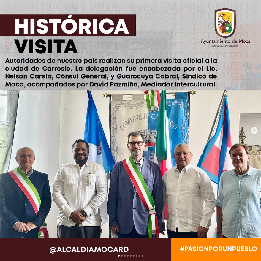 En una ocasión sin precedentes, las autoridades de la República Dominicana han realizado su primera visita oficial a la ciudad de Carrosio. La delegación dominicana fue encabezada por el Lic. Nelson Carela Luna, Cónsul General de la República Dominicana, y Miguel Guarocuya Cabral, Síndico de Moca, acompañados por David Pazmiño, Mediador Intercultural.