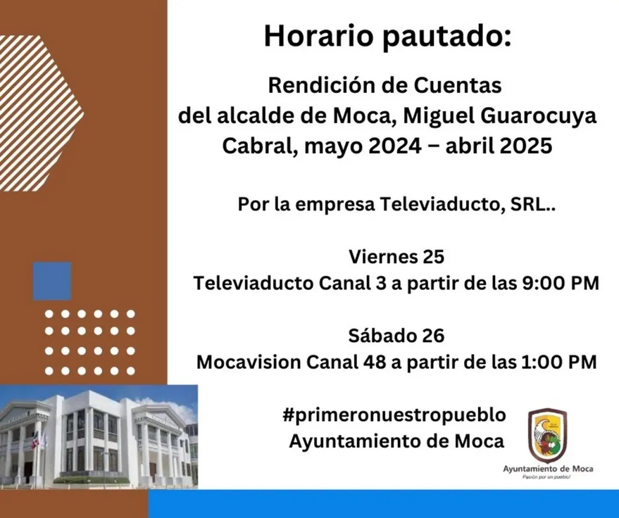 Horario pautado: Rendición de Cuentas del alcalde de Moca, Miguel Guarocuya Cabral, mayo 2024 – abril 2025Por la empresa Televiaducto, SRL..Viernes 25Televiaducto Canal 3 a partir de las 9:00 PMSábado 26Mocavision Canal 48 a partir de las 1:00 PM#primeronuestropuebloAyuntamiento de Moca