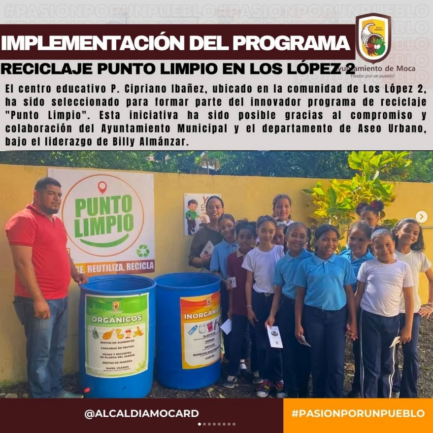 Moca,06 Diciembre 2024. El centro educativo P. Cipriano Ibañez, ubicado en la comunidad de Los López 2, ha sido seleccionado para formar parte del innovador programa de reciclaje «Punto Limpio». Esta iniciativa ha sido posible gracias al compromiso y colaboración del Ayuntamiento Municipal y el departamento de Aseo Urbano, bajo el liderazgo de Billy Almánzar.
