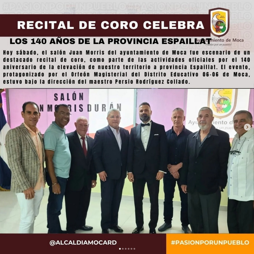 Moca,16/02/25. Hoy sábado, el salón Juan Morris del ayuntamiento de Moca fue escenario de un destacado recital de coro, como parte de las actividades oficiales por el 140 aniversario de la elevación de nuestro territorio a provincia Espaillat. El evento, protagonizado por el Orfeón Magisterial del Distrito Educativo 06-06 de Moca, estuvo bajo la dirección del maestro Persio Rodríguez Collado.