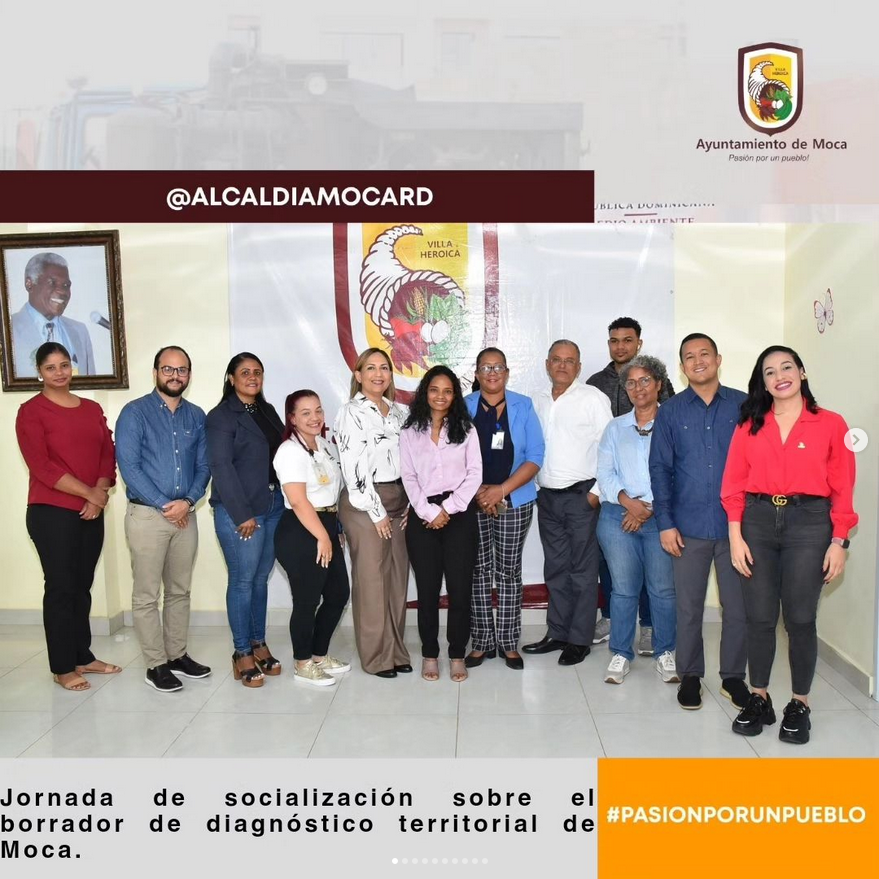 La geógrafa y planificadora territorial estratégica Lic. Nayely Germoso, consultora y la Lic. Ana Vásquez, de la dirección regional Cibao Norte de MEPyD, junto a su equipo técnico de planificadoras espaciales, dedignados por el Ministerio de Economía, Planificación y Desarrollo, a través de su Viceministerio de Ordenamiento Territorial y Desarrollo Regional dirigido por el viceministro Domingo Matías, llevaron a cabo una jornada de socialización sobre el borrador de diagnóstico territorial de Moca, zonificación y normas de implementación del Plan Municipal de Ordenamiento Territorial PMOT. En el acto estuvieron presentes el alcalde de Moca Guarocuya Cabral, Lic. Mariano García director de la OMPP, el presidente del Concejo Serafin Arroyo, la vicealcaldesa Belkis Candelier, los regidores Lic. Idelkis Félix, Ing. Janler Pérez, Dr. Omar Hernández, Dr. Gabriel Rivas, Ing. Adolfo Alvarez, Josué Figueroa, Lic. Alvyn García, Ing. Guillermo Ferreiras, Selso Diloné, Doris De León, Arq. Esther Arias, entre otros asistentes. El encuentro sensibilizó el espiritu de trabajo para lograr a la mayor brevedad un plan municipal de ordenamiento territorial de Moca para hacer eficiente y sostenible el uso de suelo.