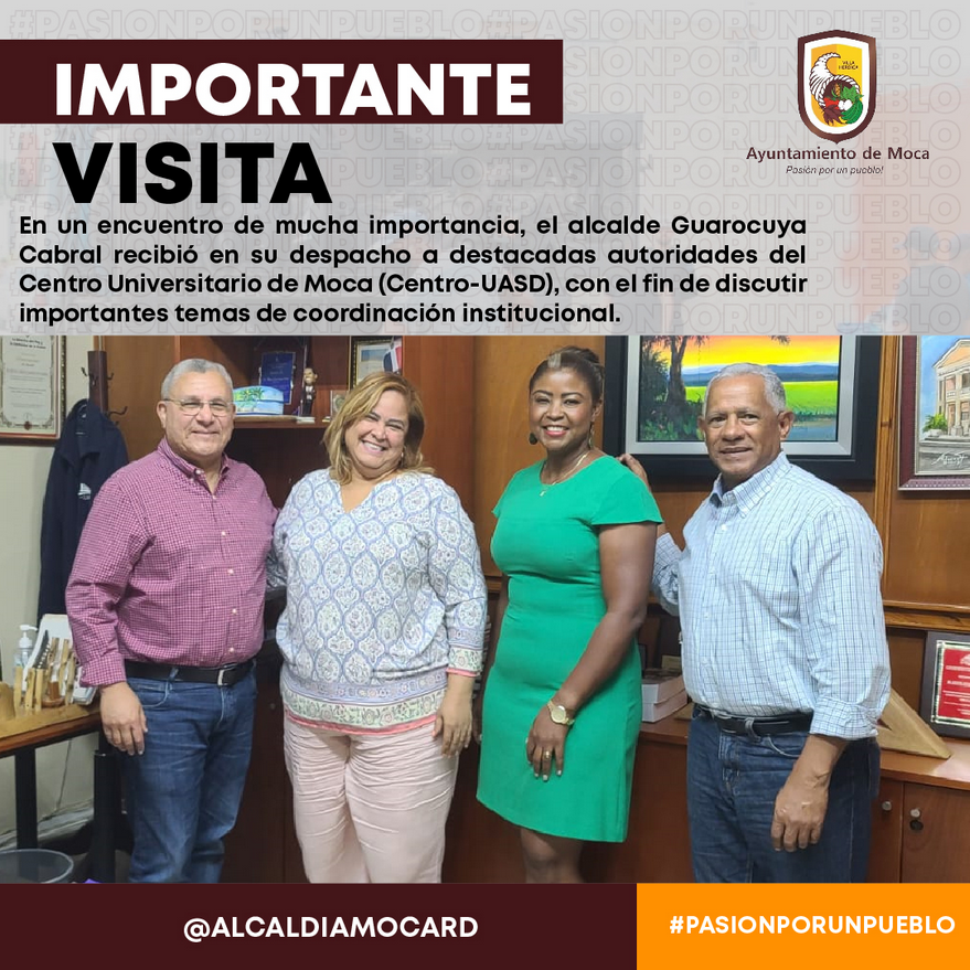 En un encuentro de mucha importancia, el alcalde Guarocuya Cabral recibió en su despacho a destacadas autoridades del Centro Universitario de Moca (Centro-UASD). La reunión estuvo encabezada por la directora del Centro, la maestra Sonia Gómez, la subdirectora, maestra Johanna Crisóstomo, y el profesor Freddy, quienes discutieron importantes temas de coordinación institucional.