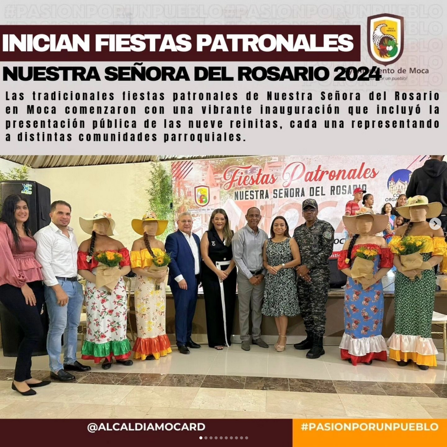 Moca. Las tradicionales fiestas patronales de Nuestra Señora del Rosario en Moca comenzaron con una vibrante inauguración que incluyó la presentación pública de las nueve reinitas, cada una representando a distintas comunidades parroquiales. El evento, que marca el inicio de una serie de celebraciones culturales y religiosas, contó con la presencia de destacadas autoridades locales y provinciales.
