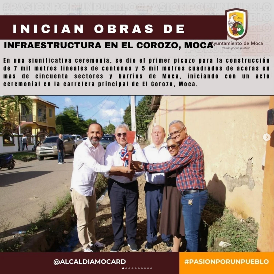 En una significativa ceremonia, se dio el primer picazo para la construcción de 7 mil metros lineales de contenes y 5 mil metros cuadrados de aceras en mas de cincuenta sectores y barrios de Moca, iniciando con un acto ceremonial en la carretera principal de El Corozo, Moca. Este proyecto, valorado en 18 millones de pesos, incluye varias decenas de lugares en el municipio incluyendo la zona posterior del Asilo de Ancianos La Santísima Trinidad, lo que tiene como objetivo mejorar el drenaje pluvial, crucial para prevenir enfermedades en la vulnerable comunidad de más de ochenta nonagenarios.