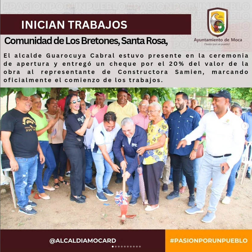 Se dio inicio a los trabajos de construcción de contenes y badenes en la comunidad de Los Bretones, Santa Rosa, Moca, en un proyecto que promete mejorar significativamente la infraestructura local. El alcalde Guarocuya Cabral estuvo presente en la ceremonia de apertura y entregó un cheque por el 20% del valor de la obra al representante de Constructora Samien, marcando oficialmente el comienzo de los trabajos.