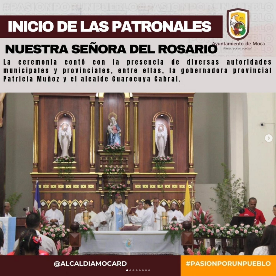 La noche del 28 de septiembre marcó el inicio de las fiestas patronales de Nuestra Señora del Rosario en Moca con una solemne eucaristía concelebrada por el obispo Tomás Morel, varios sacerdotes, diáconos y presidentes de asamblea. La ceremonia contó con la presencia de diversas autoridades municipales y provinciales, entre ellas, la gobernadora provincial Patricia Muñoz y el alcalde Guarocuya Cabral. También asistieron figuras destacadas como los profesores José R. Matías y Luis Quezada, y la dirigente histórica de la Unión de Juntas de Vecinos, profesora Milagros Rosario Candelier. El evento reunió a muchos munícipes comprometidos con el esplendor y la tradición cultural de Moca. Al Padre Edwin Alonso el ayuntamiento le entregó una proclama como «Modelo de párroco en Moca».